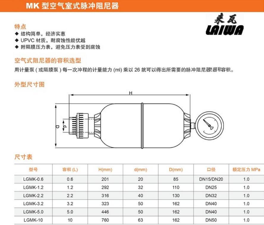 脈沖阻尼器又名脈動緩沖器、脈動阻尼器,是消除管路脈動的常用元件,是計量泵必須配備的附件。脈沖阻尼器能夠平滑由柱塞泵、隔膜泵等容積泵引起的管路脈動及消除系統(tǒng)的水錘現(xiàn)象,它由耐腐蝕的隔膜將氣體與管路中的液體隔離,通過氣室容積的變化平滑管路脈動,對受壓液體的能量進行儲存和釋放。該系列產(chǎn)品廣泛用于化工、水處理、食品飲料、電力、造紙、紡織及流體機械等行業(yè)。